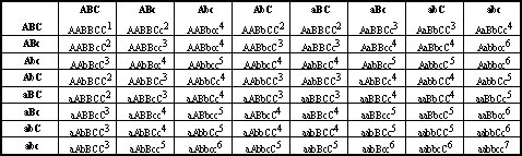 Üç farklı yerde bulunan 6 genin etkili olduğu bir özellikte, bu üç lokusta da heterozigot genotipte bulunan iki bireyin çiftleşmesinden meydana gelecek genotipler (aynı sayı ile belirtilen genotiplerin etkisi eşittir).